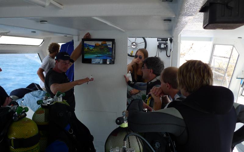 ... aber halt, da ist ja noch das Briefing - und hier musste man schon genau zuhören, schließlich waren wir auf eigene Faust ohne Diveguide unterwegs. Es war aber (fast) nie ein Problem, das Boot wiederzufinden (halbwegs gut mit dem Kompass umgehen musste man aber schon). Nur einmal haben wir die Navigation buchstäblich verpeilt und das Boot irgendwie verpasst - aber egal, kleine Missgeschicke gehören dazu ... |