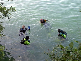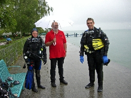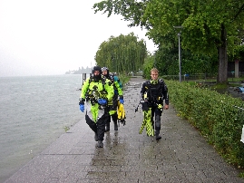 An einem weiteren Tauchtag geht's zur Steilwand zwischen dem Überlinger Campingplatz und dem Bau-Graf. Geparkt wird komfortabel auf dem großen Parkplatz. Von dort erreicht man zu Fuß den Einstieg in den See. Endlich spielt auch das Wetter mit, so dass man beim Umziehen im Freien nicht im Regen stehen muss. |