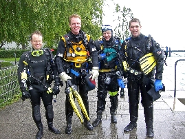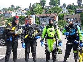 Ein starkes Team - vier Taucher unserer Gruppe direkt nach dem Tauchgang. Die Tauchgänge klappen bestens und der Spaß kommt nicht zu kurz. |